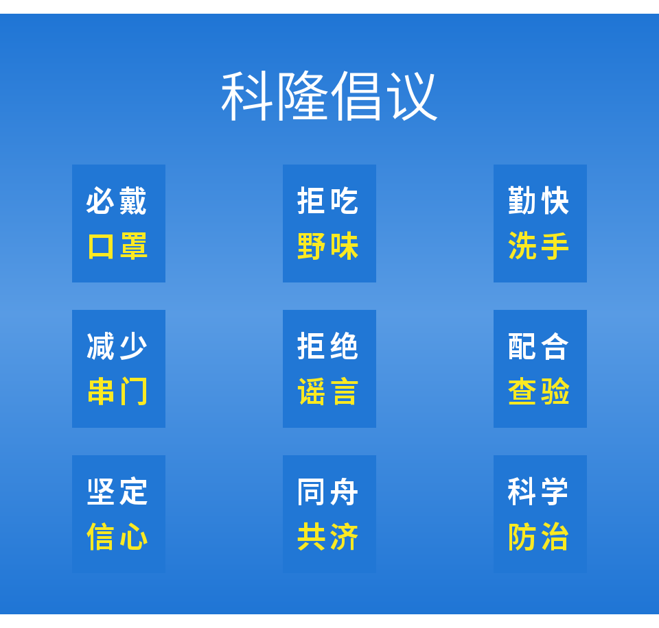 河南科隆新能源股份有限公司總經(jīng)理程迪表示:“疫情爆發(fā)以來,我們時刻關(guān)注疫情發(fā)展動態(tài),想為抗擊疫情承擔(dān)一份責(zé)任,獻(xiàn)出自己的綿薄力量!同時,我們也將落實(shí)國家相關(guān)要求,全力配合疫情防控工作,在公司內(nèi)做好消毒、疫情防控宣傳工作,密切關(guān)注假期期間員工健康情況,為共同抗擊疫情貢獻(xiàn)力量。”